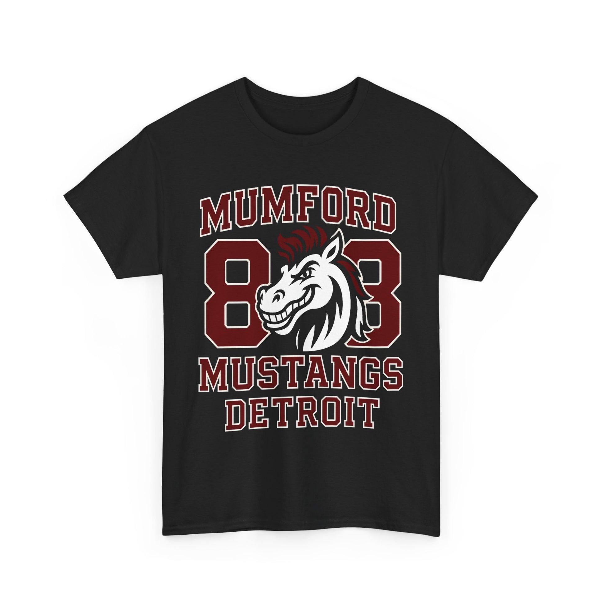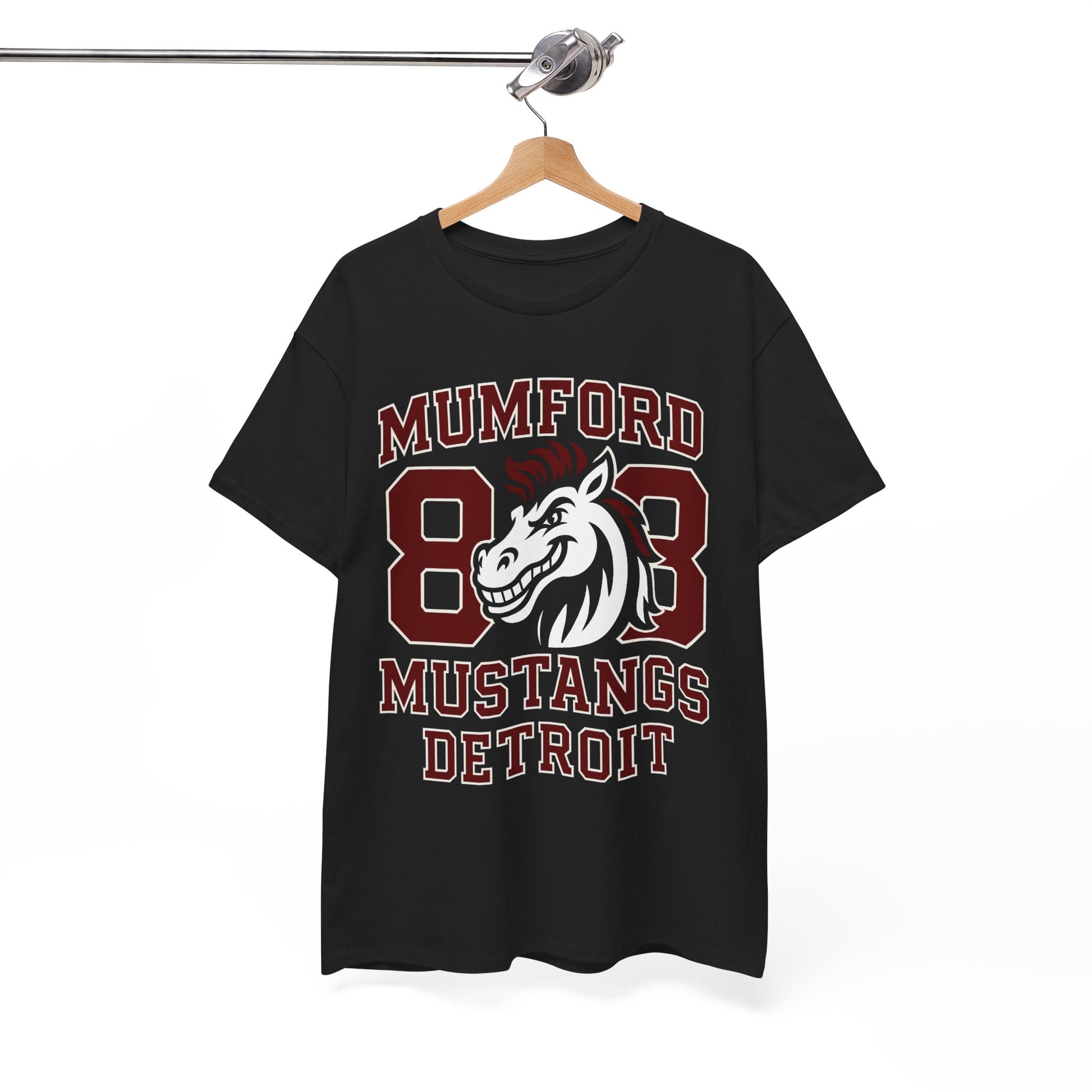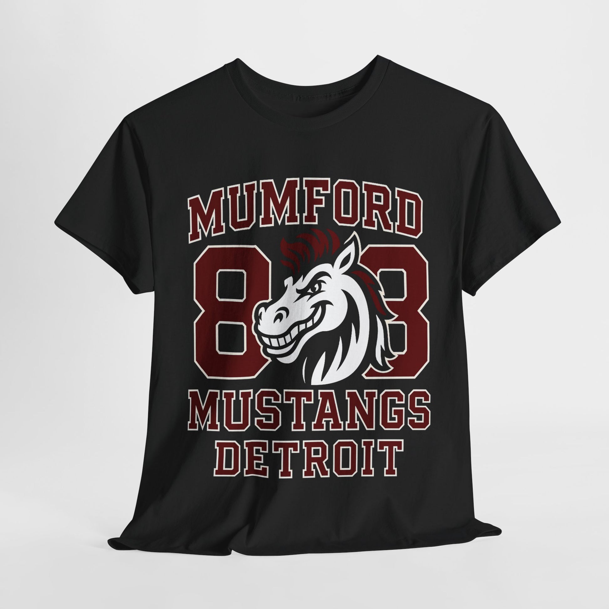 This Detroit Mumford '88 Mustangs school pride tee exudes a nostalgic and classic vibe, perfect for showing off your school spirit or love for vintage cars. It is ideal for students, alumni, or car enthusiasts looking to express their pride and style. This tee is great for back-to-school season, school sporting events, car shows, or casual outings.